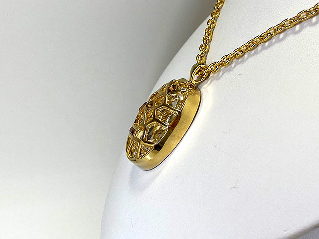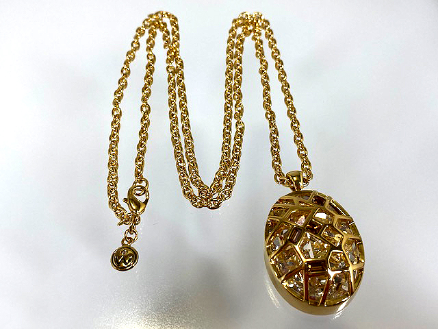 32,450円 (税込)+配送料 中に大きなクリスタルが一石、網目の部分にトパーズ色が数粒施されたロングネックレスです。
