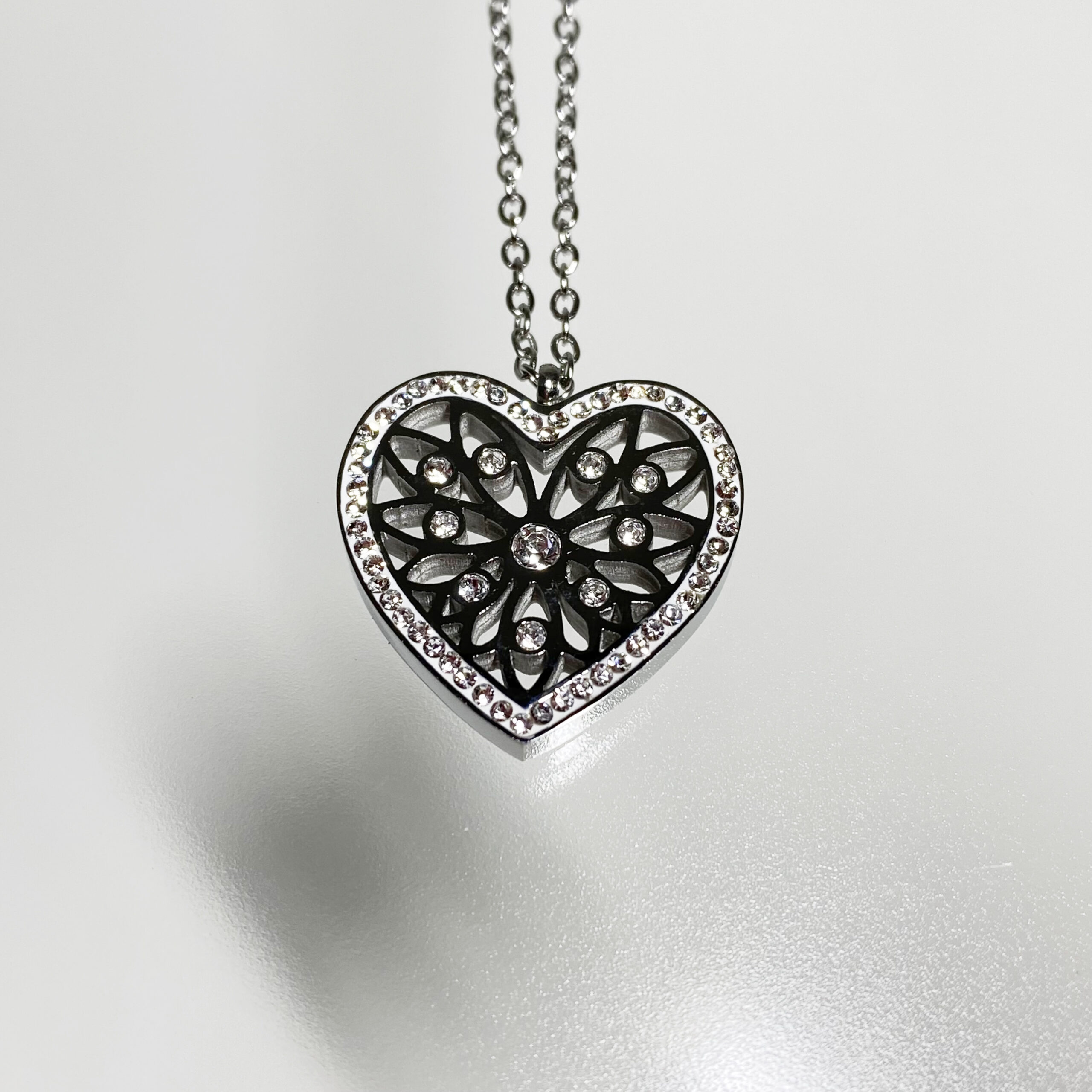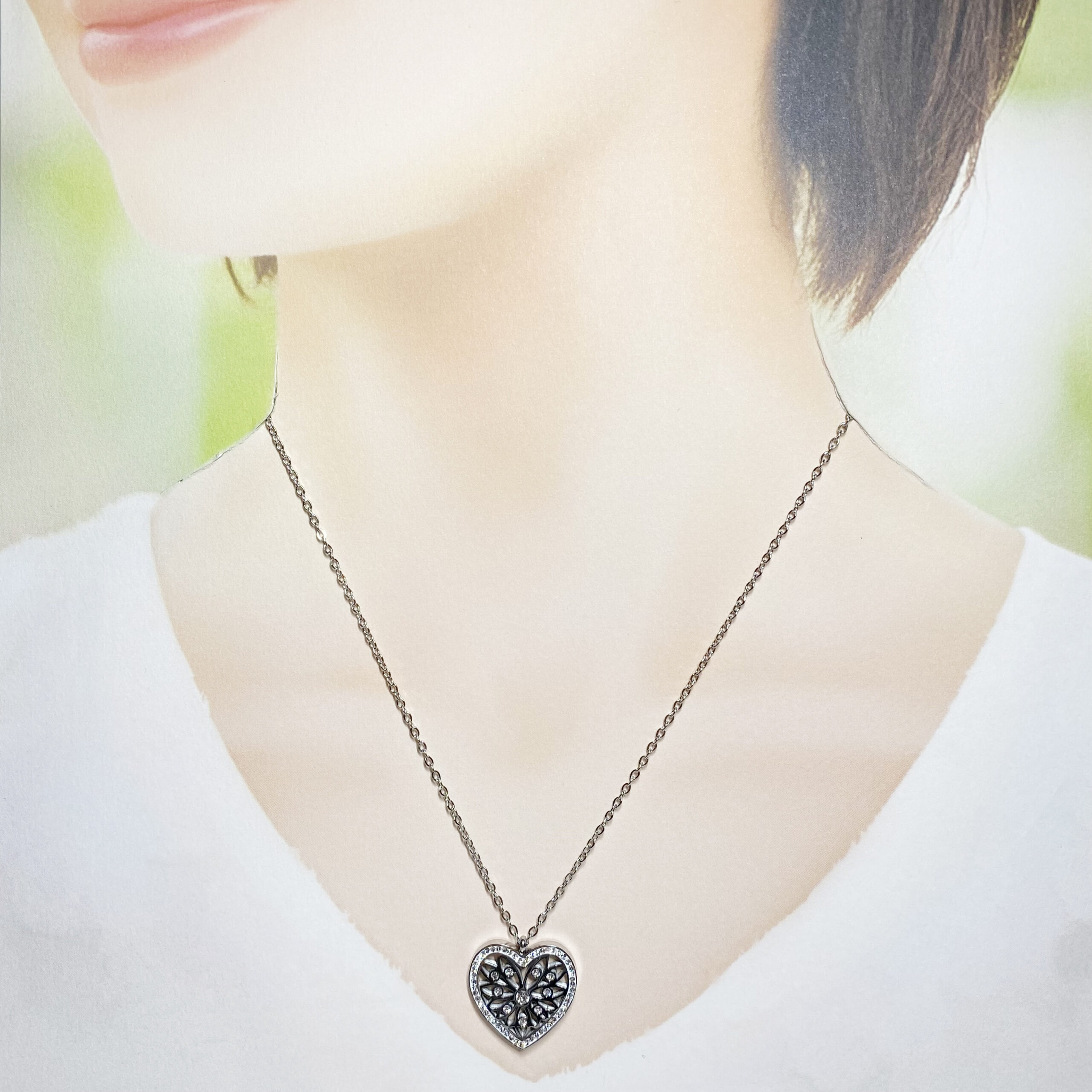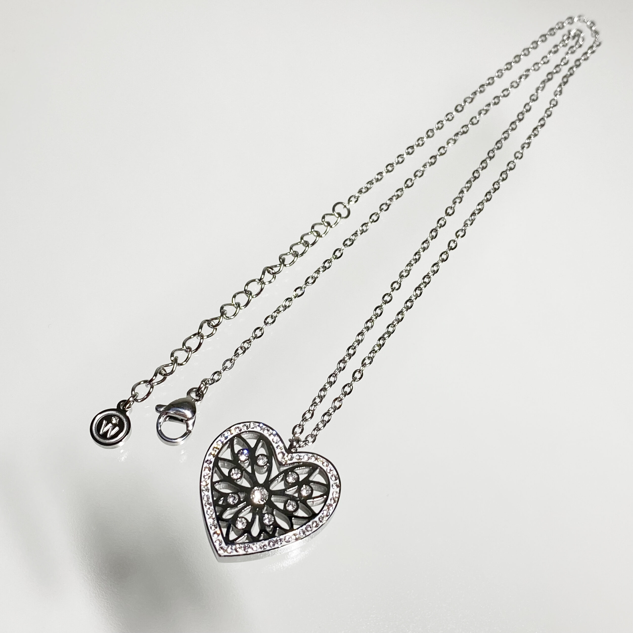 13,200円 (税込)+配送料 ハートの枠の中は透かし彫りのように繊細なデザインのオリバーウェバー スワロフスキー ステンレススチール316L製 ペンダント ネックレス Towardsは、甘すぎないハートであなたのスタイルを引き立てることでしょう。