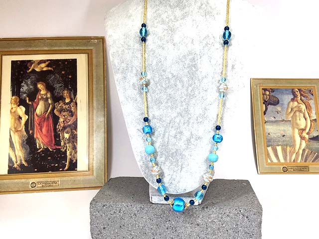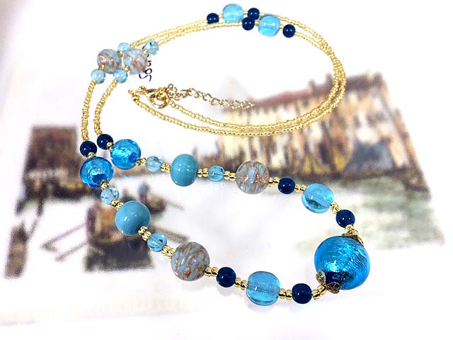 ベネチアンガラスで豪華に仕上げたロングネックレスです。水色のビーズに銀箔を織り交ぜているので、穏やかな輝きを放ちます。一つ一つを手作業で緻密に作り、一つひとつのビーズの形や色にも個性があり、丁寧な加工も相まり、まるでベネチアの夜を歩いているかのような気分に浸れる逸品です。