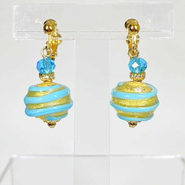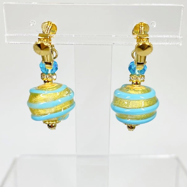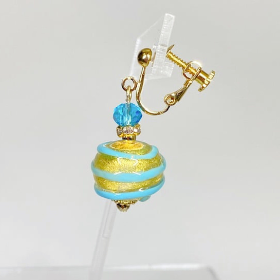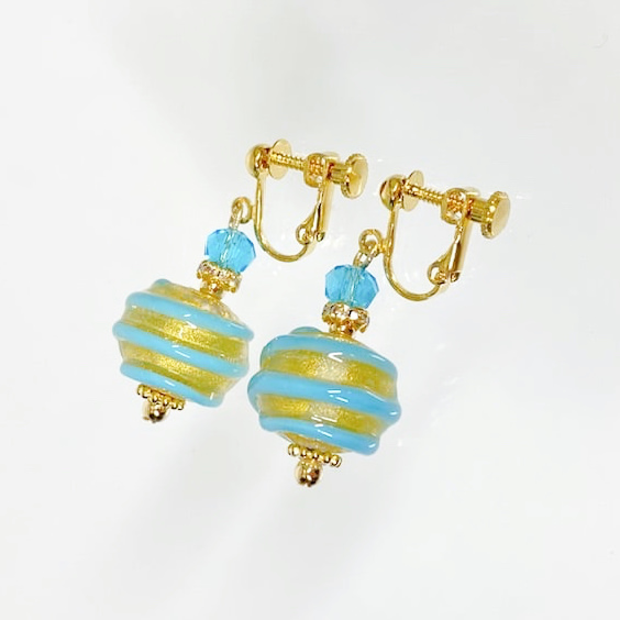 金地に水色が映えるベネチアンガラスのイヤリング、CANDY。24金箔の素材を使用しており、鮮やかな色彩と美しい縞模様が特徴のアクセサリーです。