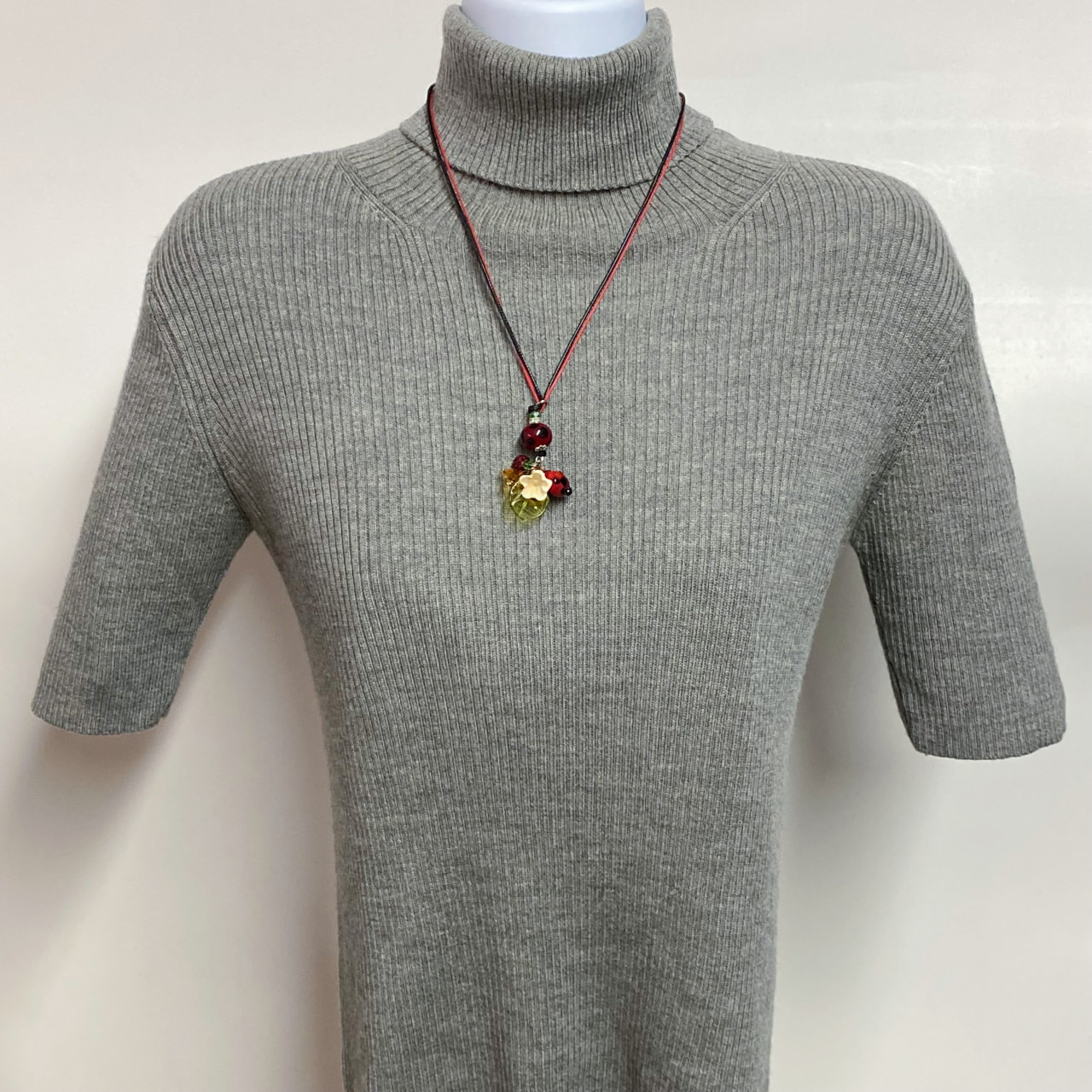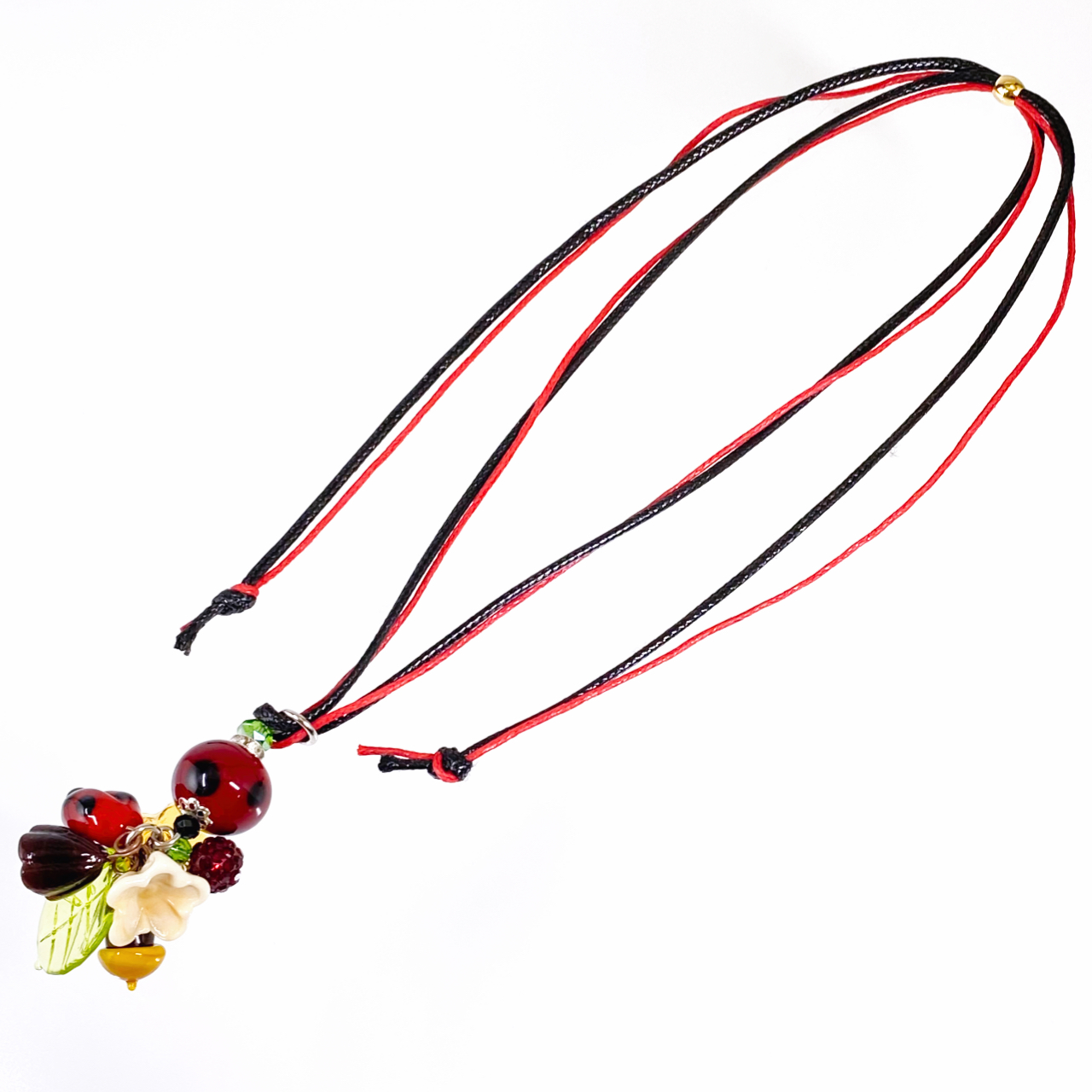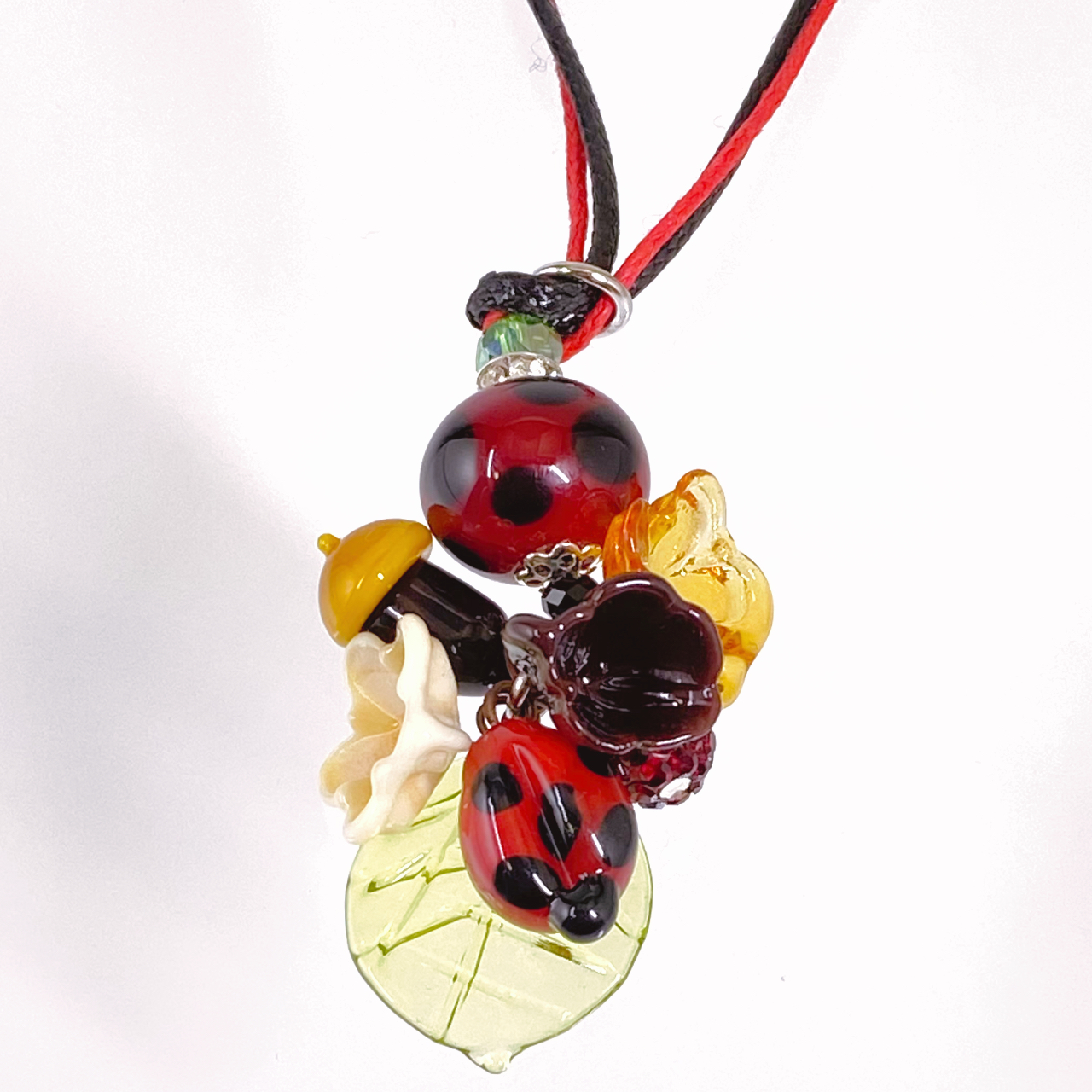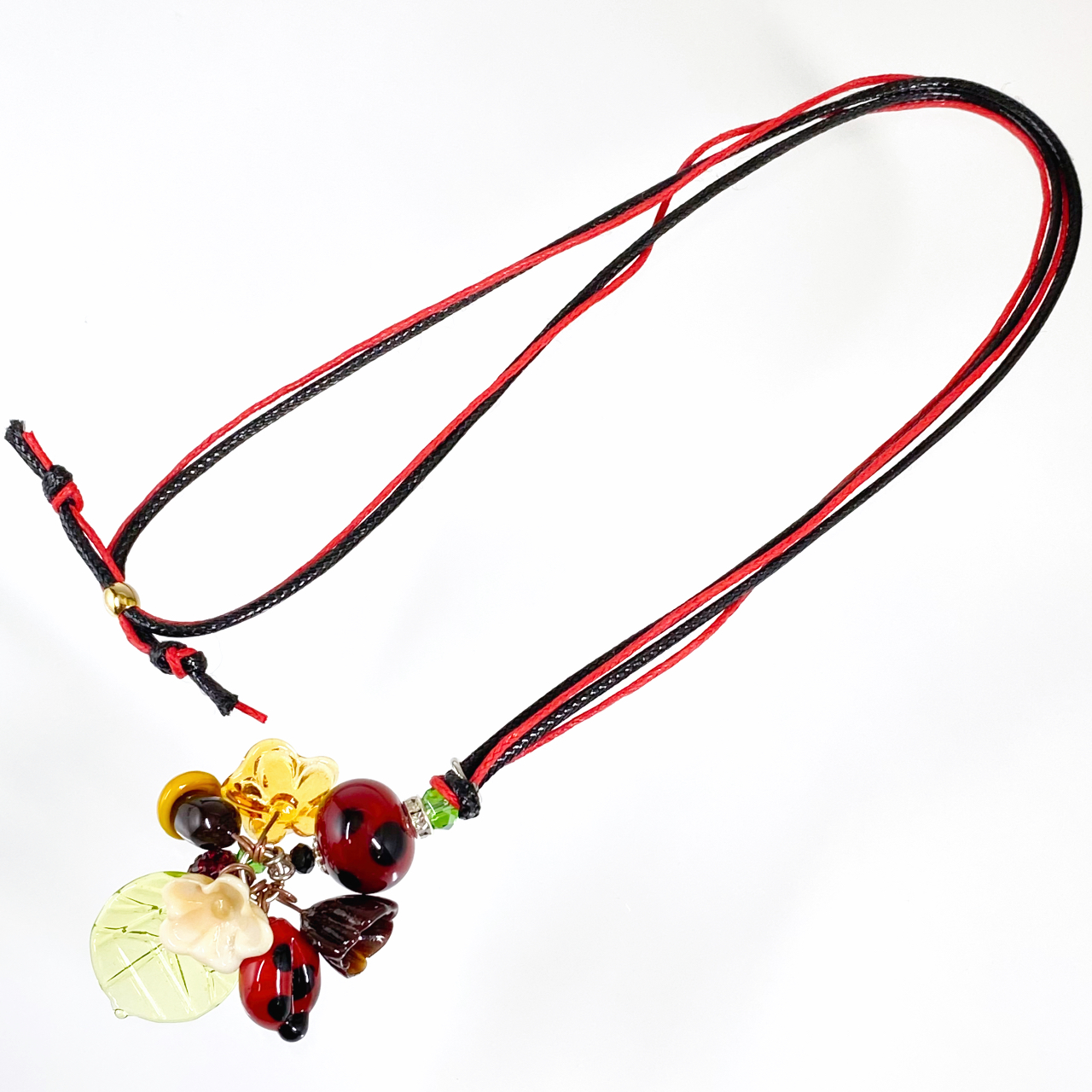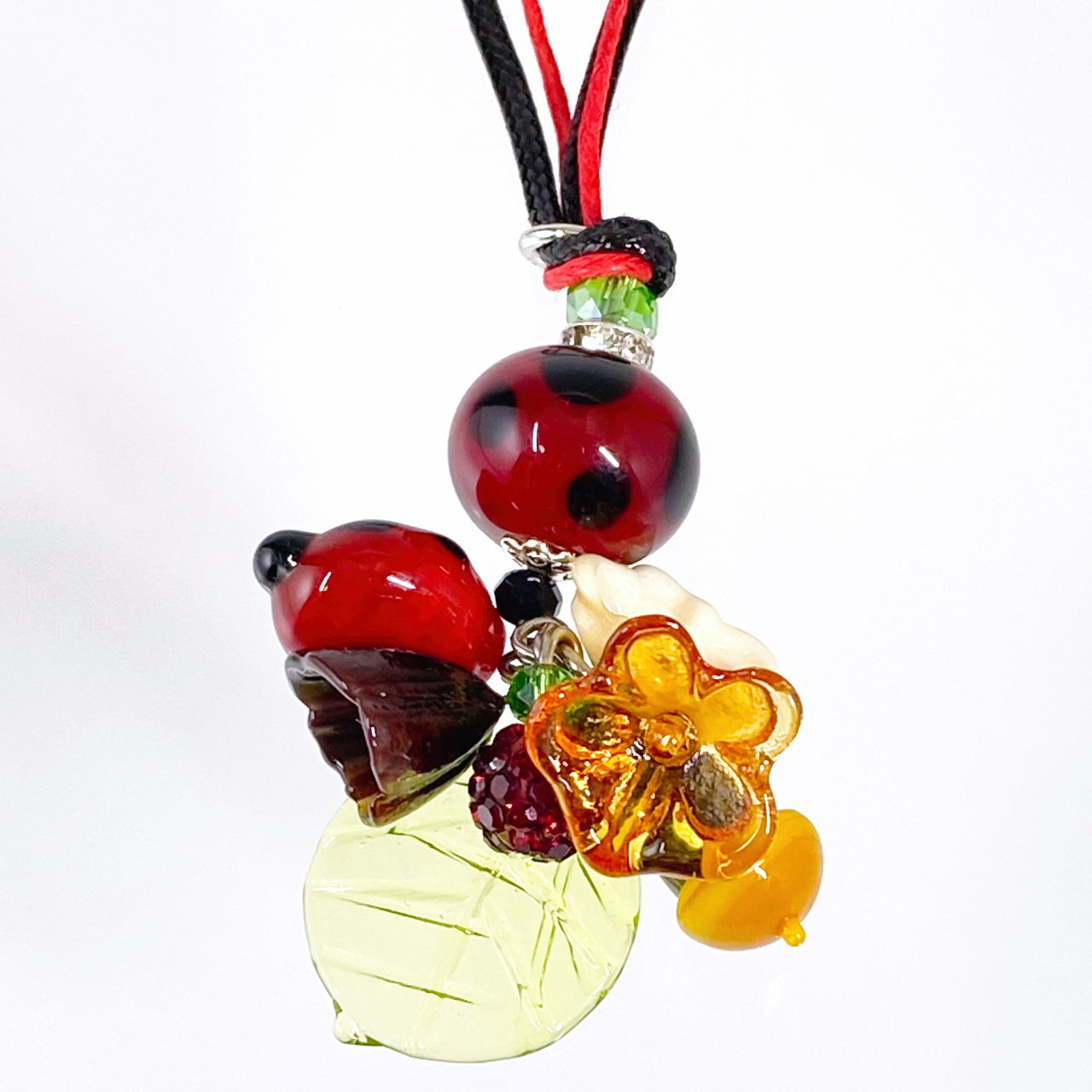 赤いフォーシーズンズフラワーが散りばめられた中に、幸せを呼ぶとされるキュートなてんとう虫が顔を出している姿が可愛らしい、ベネチアンガラスの美しい色合いと愛らしさが融合したネックレスです。