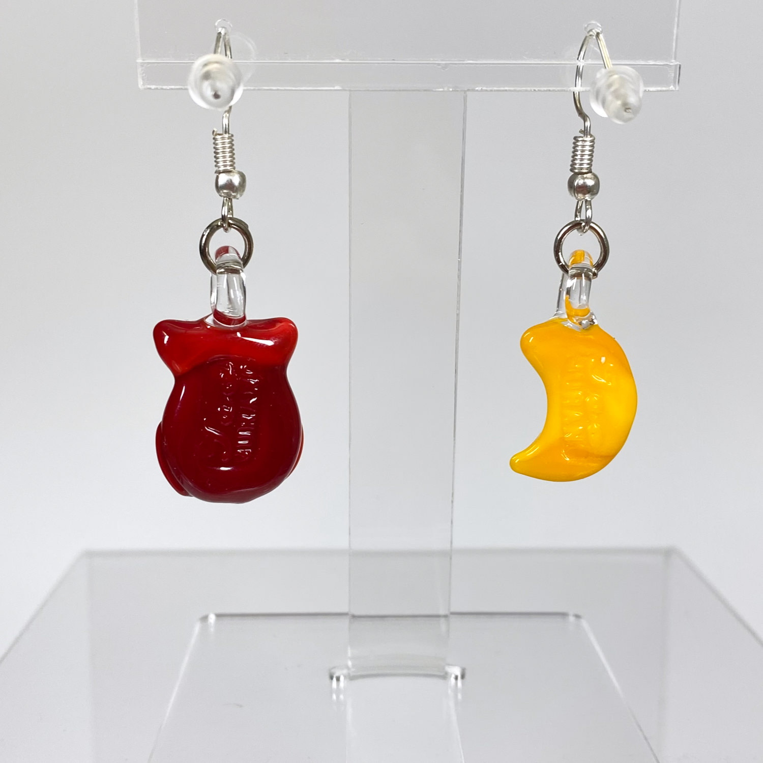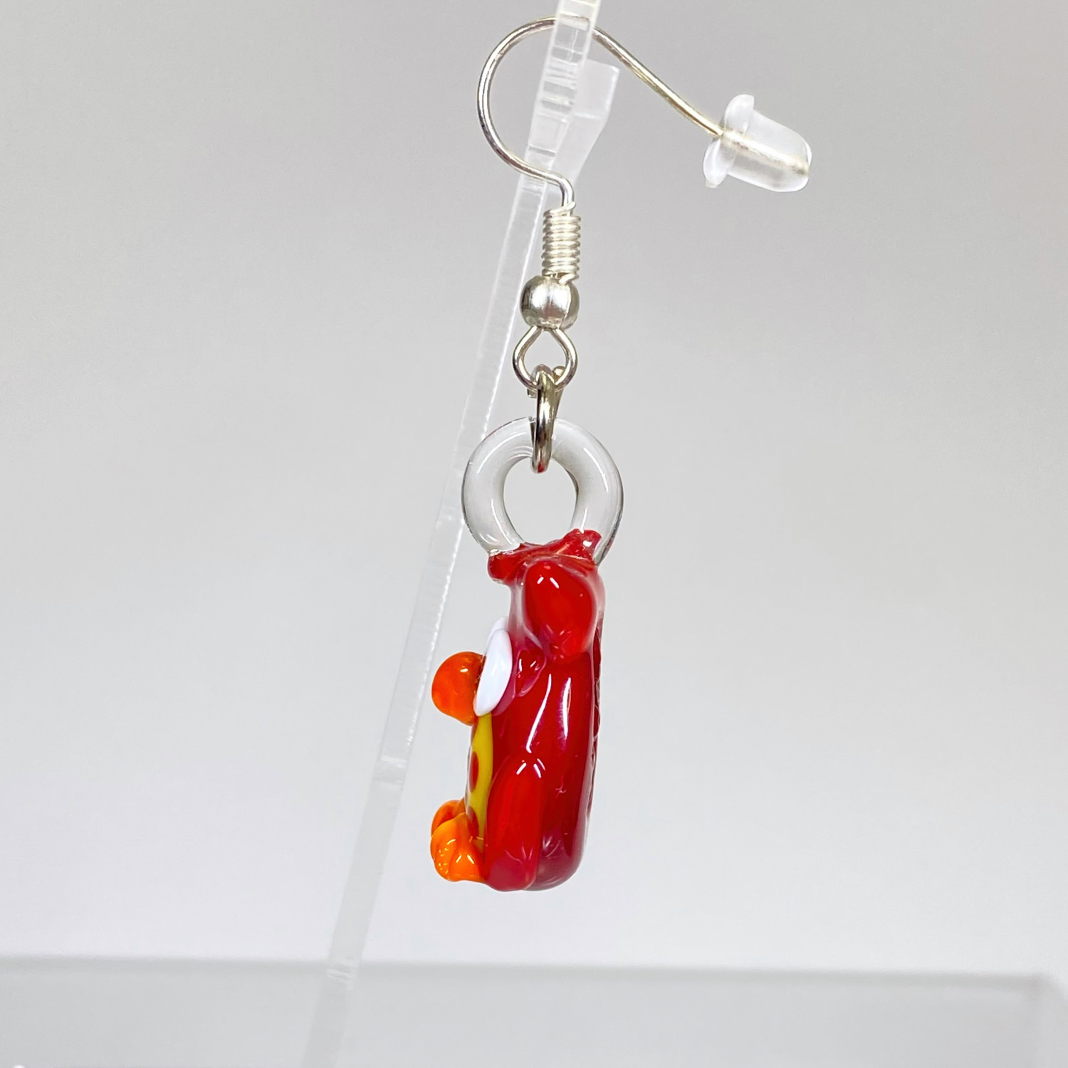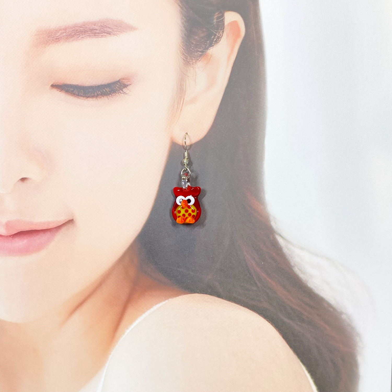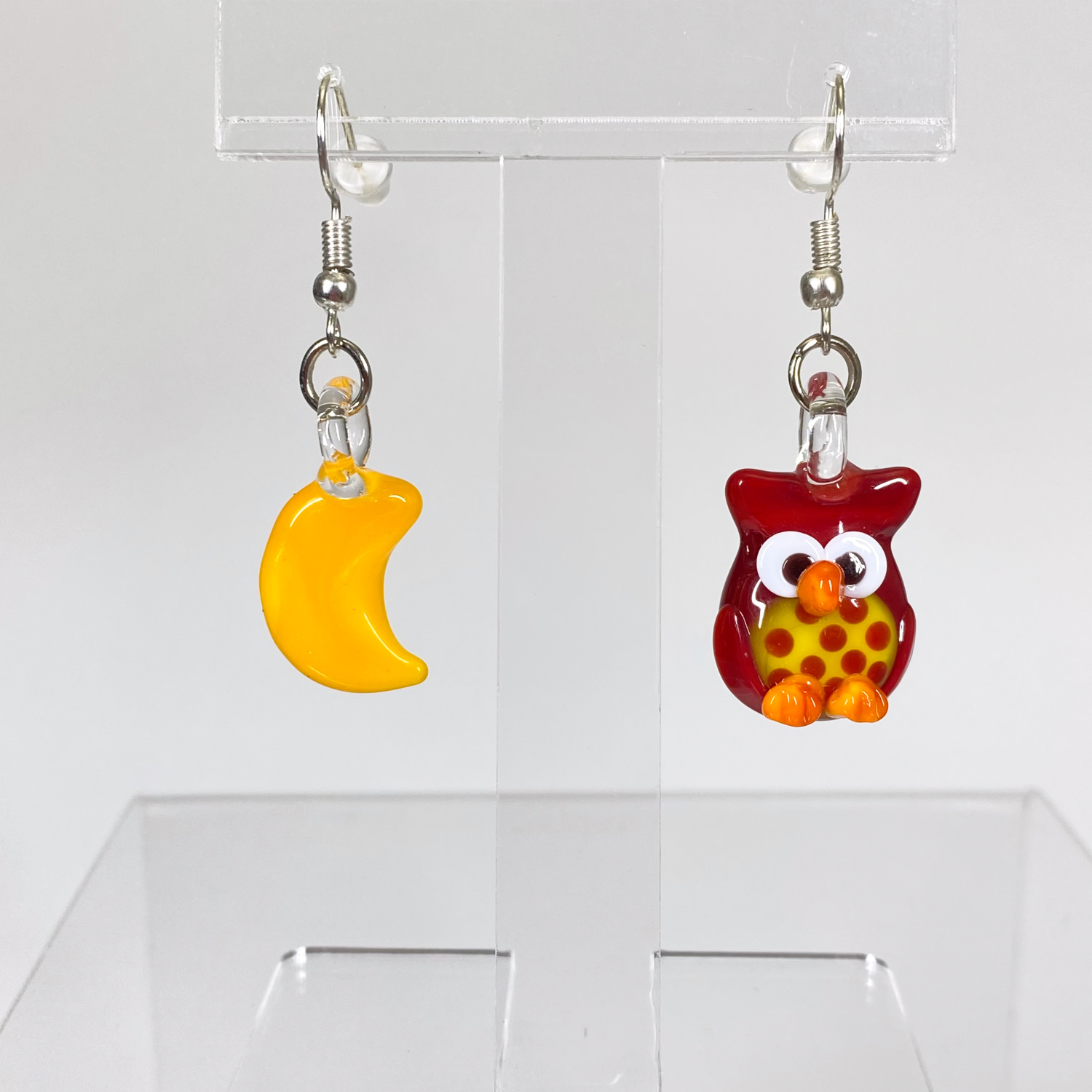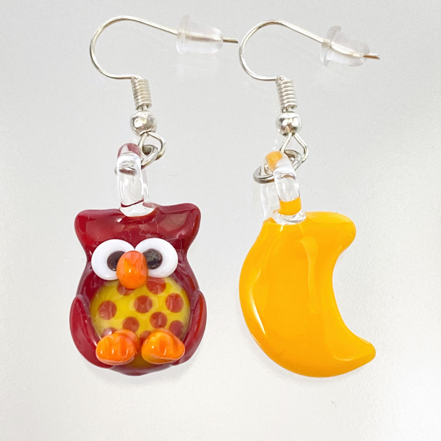 深い赤色のお澄ましが可愛いフクロウと色鮮やかな三日月のモチーフが目を引く、ベネチアンガラスのピアス『フクロウ』です。ベネチアの若きデザイナーがかわいらしく個性的にデザインしています。