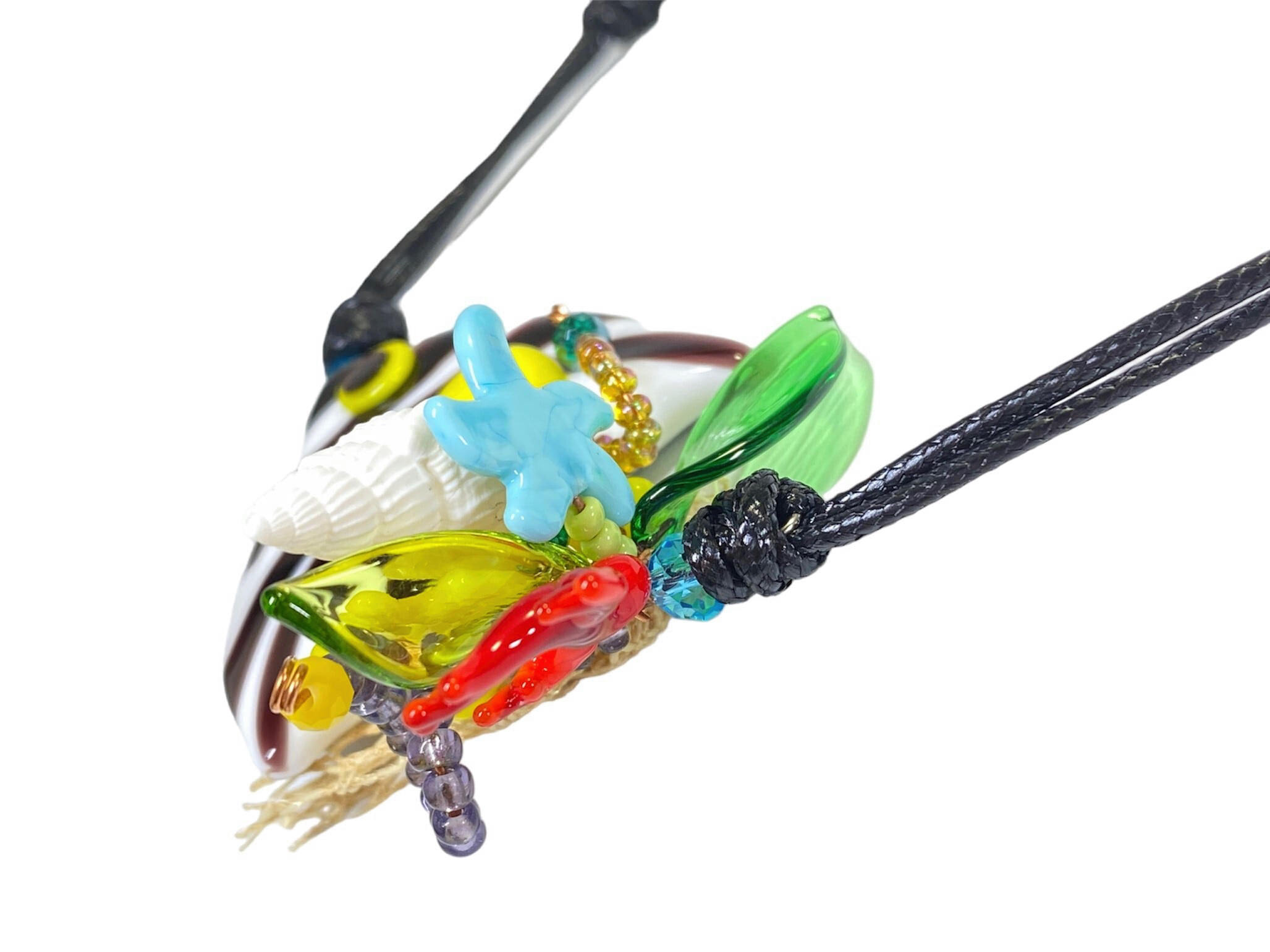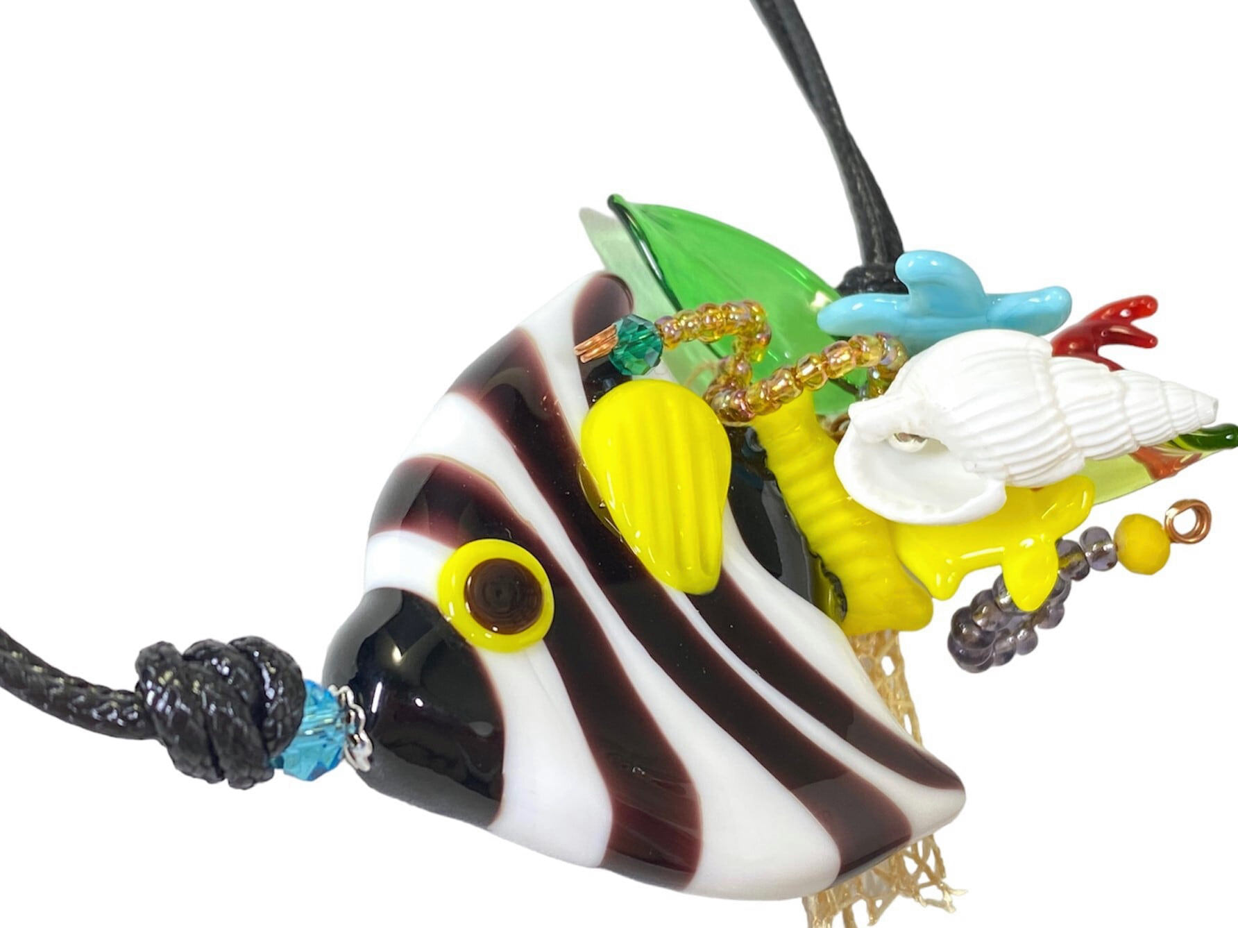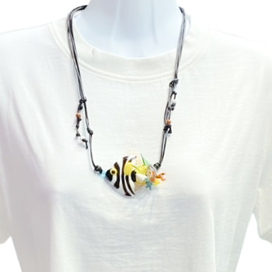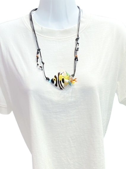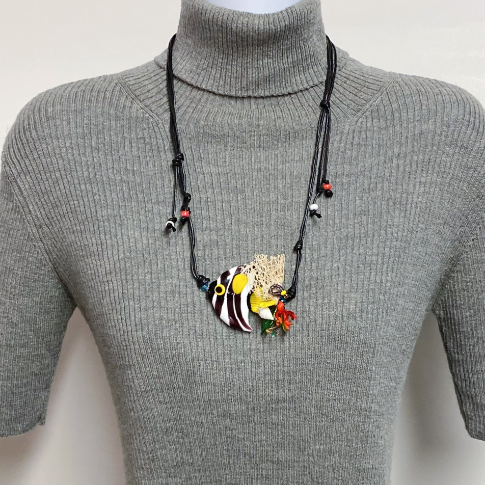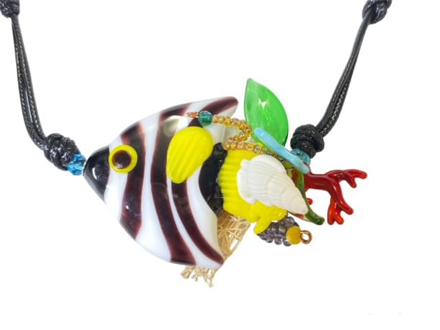 華やかでエキゾチックな熱帯魚の世界観を、ベネチアンガラスのロングネックレスで表現したアクセサリーです。透明感のあるガラス素材に、熱帯魚の美しい彩色が緻密で繊細に施されています。