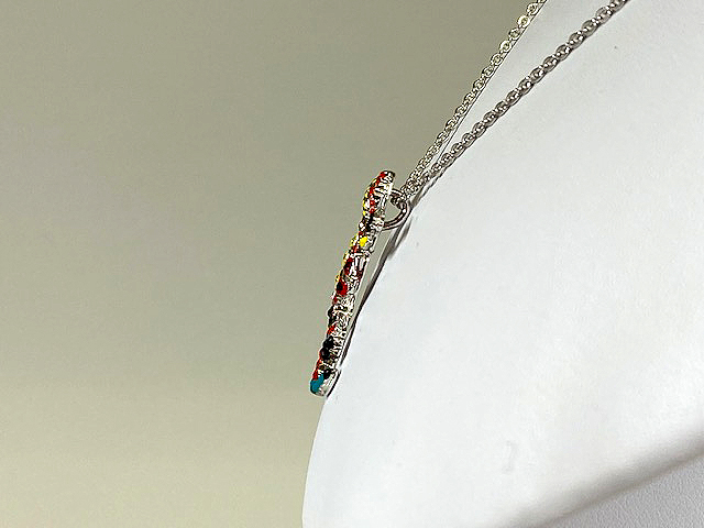 17,600円 (税込)+配送料 エナメル加工の上にクリスタルを散りばめたユニークなモチーフのネックレスです。