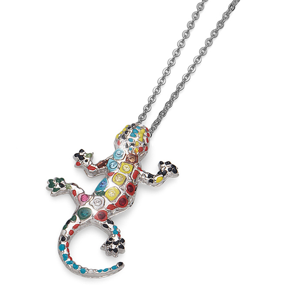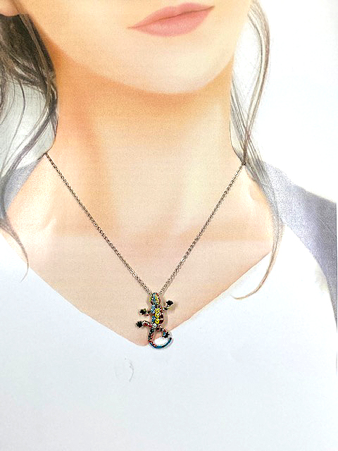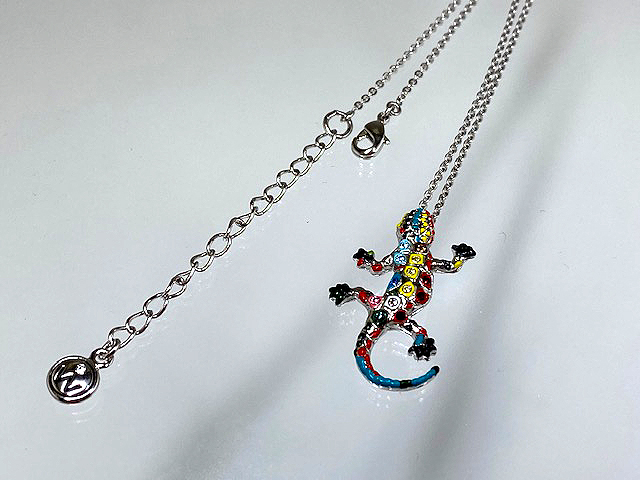 エナメル加工の上にクリスタルを散りばめたユニークなモチーフのネックレスです。