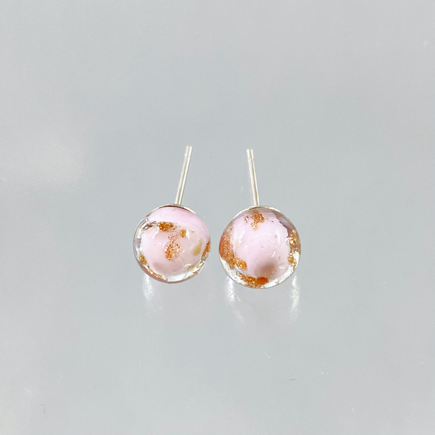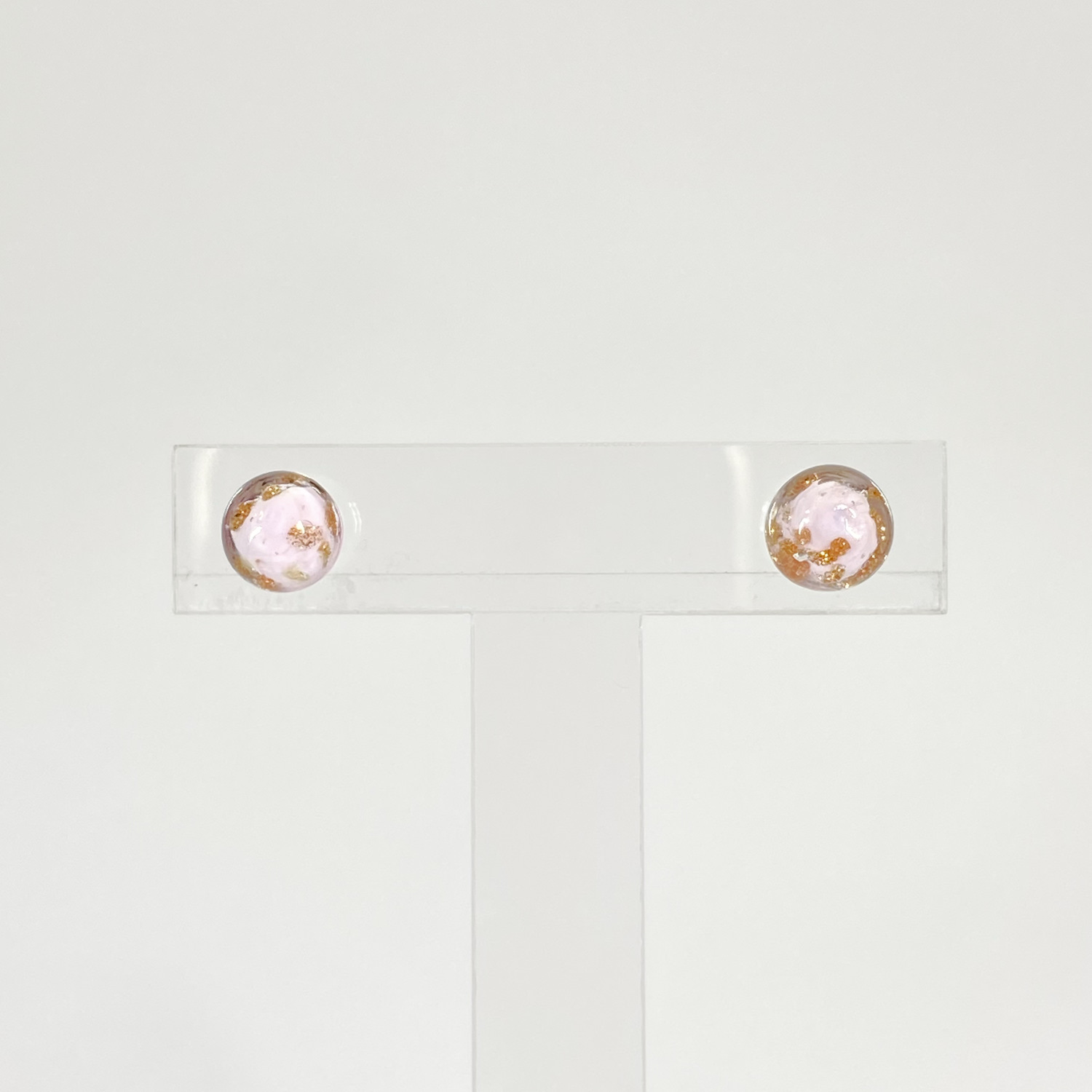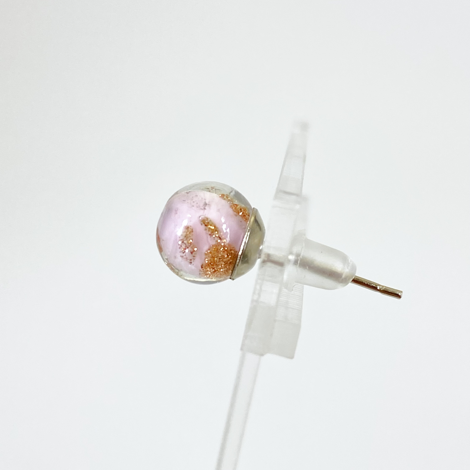 上品でやさしいピンク色のガラスの中に散りばめられた金色が上品に煌めき、耳元で上品に輝きを放つピアスが女性のエレガントさを一層引き立てます。