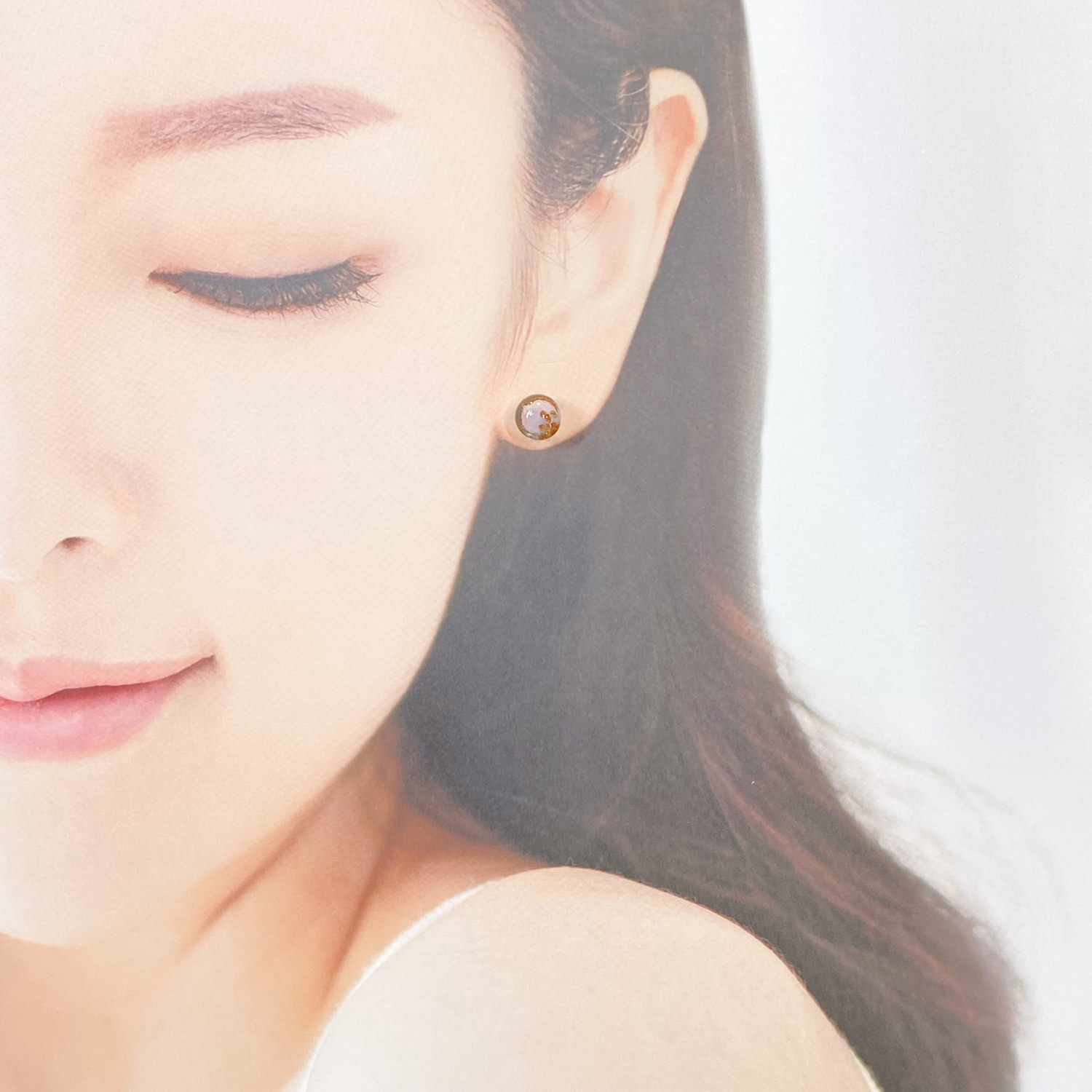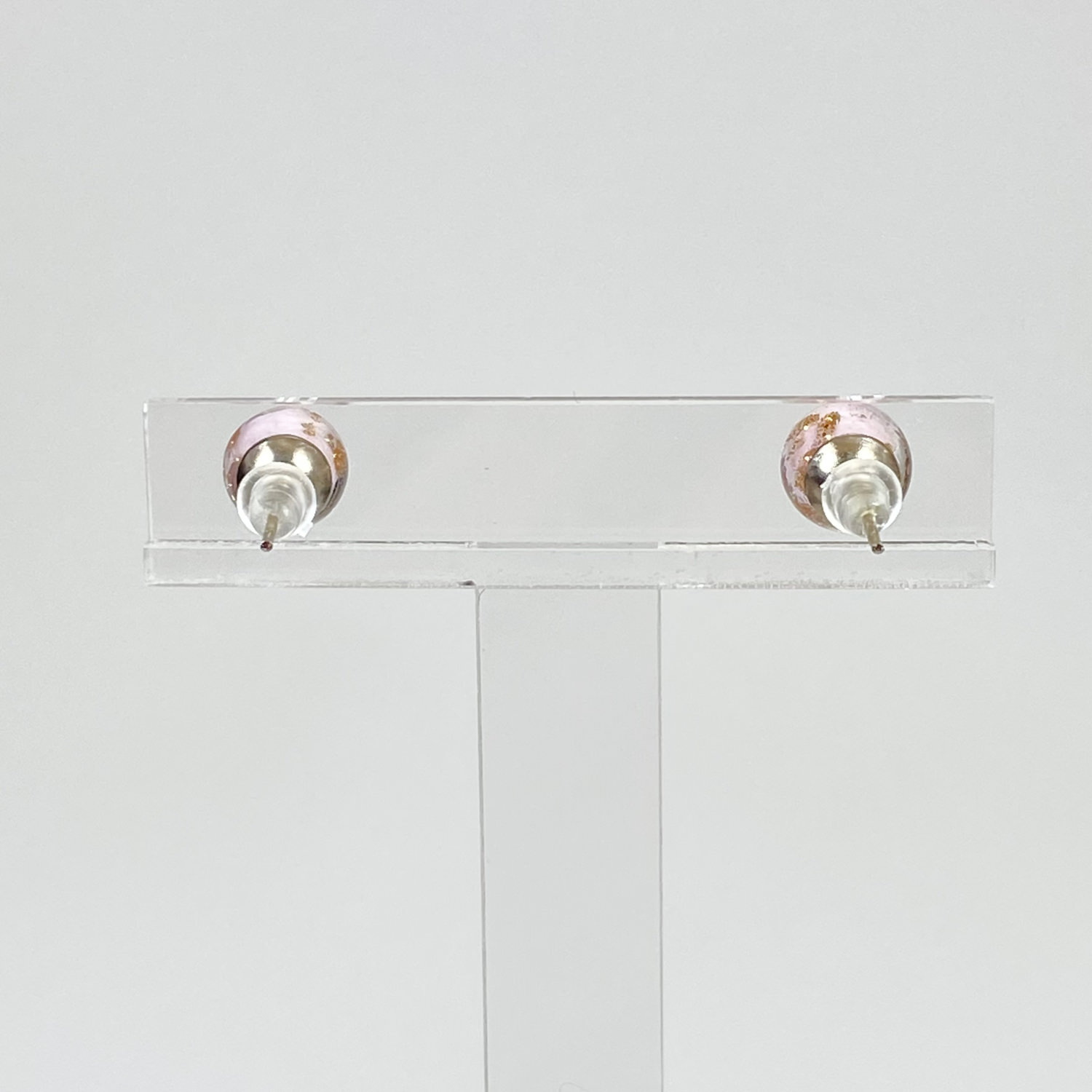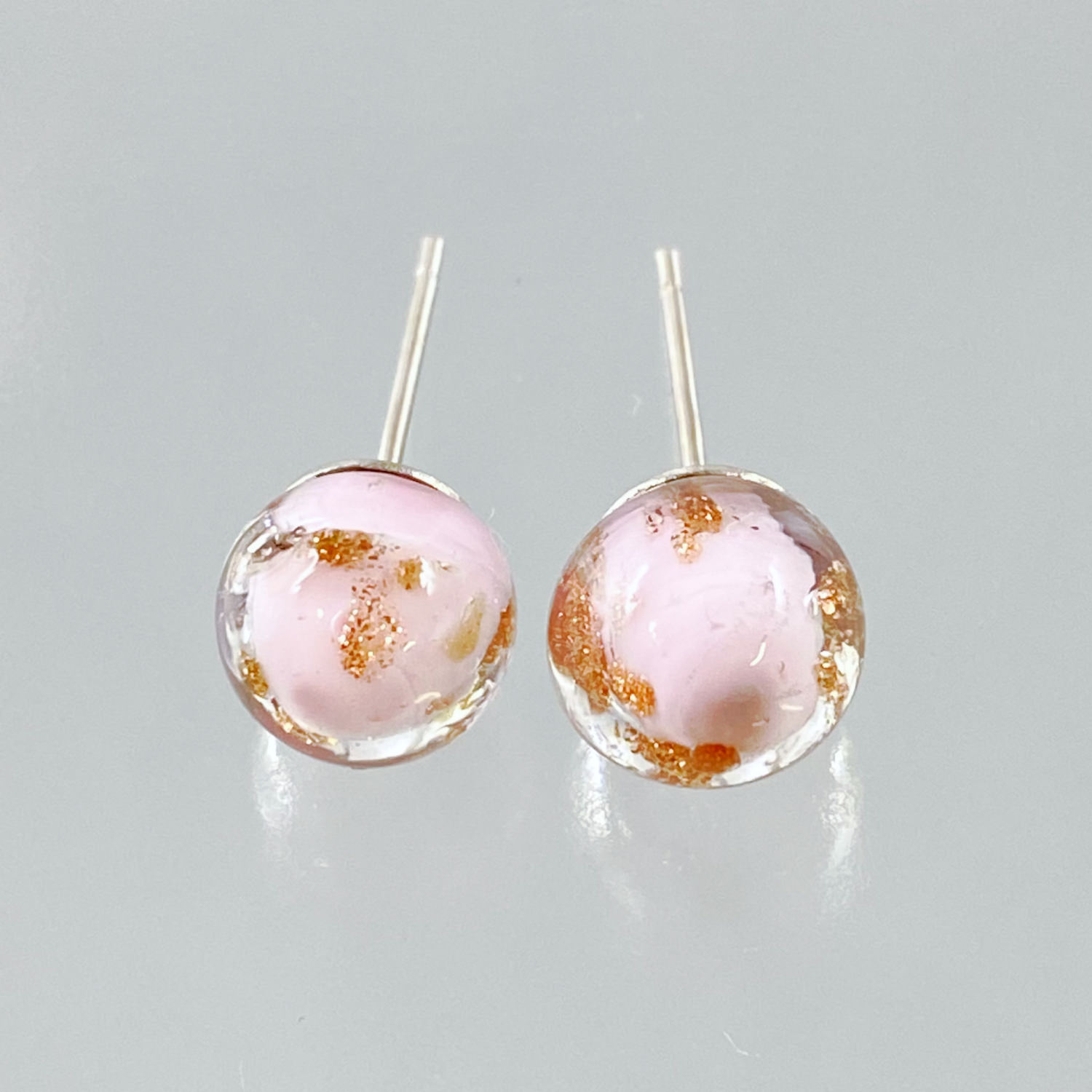 上品でやさしいピンク色のガラスの中に散りばめられた金色が上品に煌めき、耳元で上品に輝きを放つピアスが女性のエレガントさを一層引き立てます。